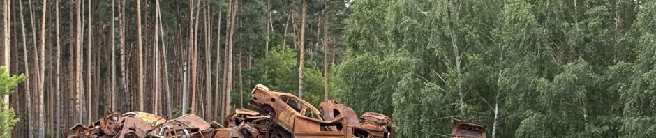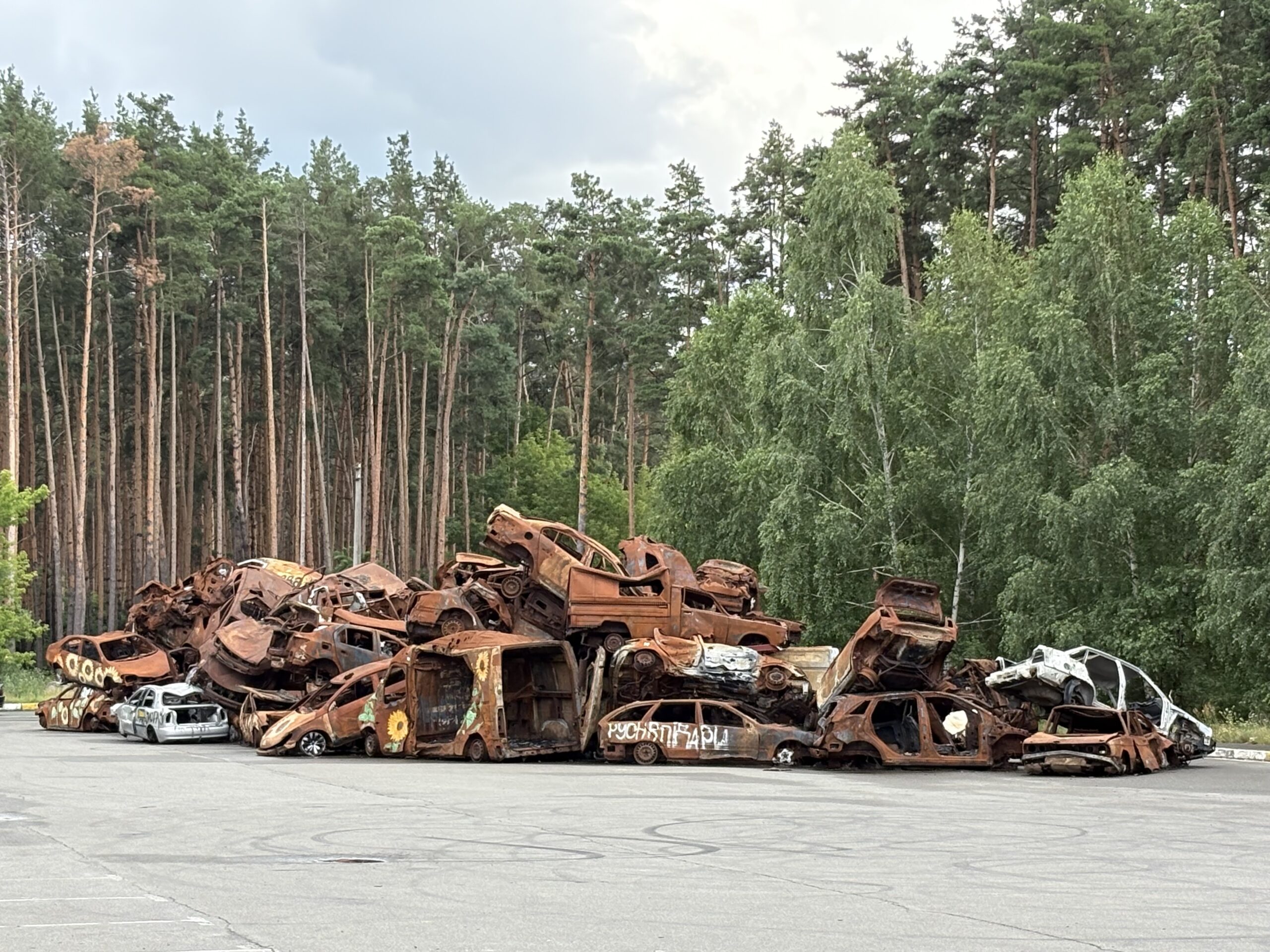 One informant told Klumbytė: “Only death is worse than occupation.” Klumbytė explained this quote by delving into how the people who confided in her understood the importance of home. Their physical houses took on new significance to Ukrainians. Homes, as they told Klumbytė, are filled with memories, family, and a sense of safety. Many did not have the resources necessary to leave, so the idea of letting Russian soldiers take over their home was worse than leaving. This dilemma was particularly heightened in Eastern Ukraine, which has been under Russian occupation since 2014. Escaping was a long and dangerous process full of checkpoints and soldiers one had to get past. Klumbytė shared a photo of stacked burned-out cars that now serves as a monument. It commemorates the large number of people trying to escape the occupation to save their families who were killed when Russian forces attacked their cars.