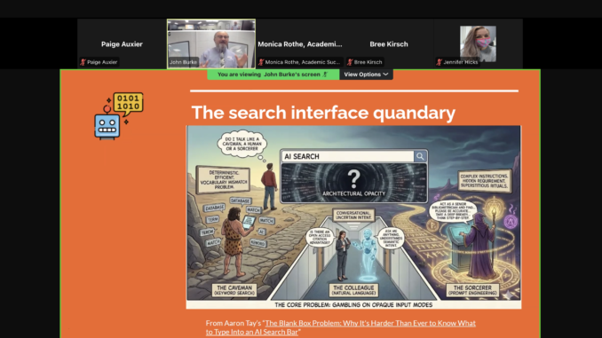 Burke started his presentation by enlightening his audience regarding the realities of the ever-increasing connection between AI and research. Nowadays, for example, popular search engines like Google are providing AI overviews in response to user inquiries, without prompting. So, due to the ubiquity of such AI encounters when conducting research, it’s becoming more important for individuals to develop an understanding of how to effectively and ethically implement AI into their research practices.